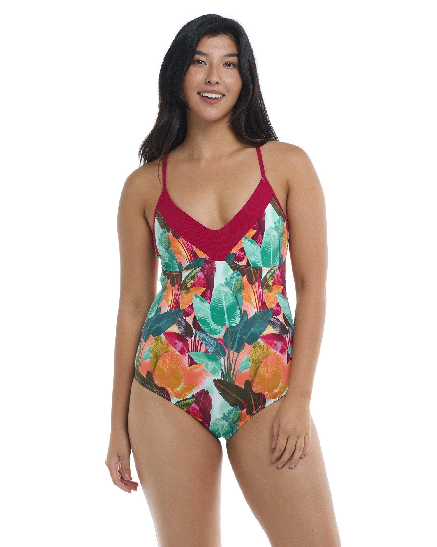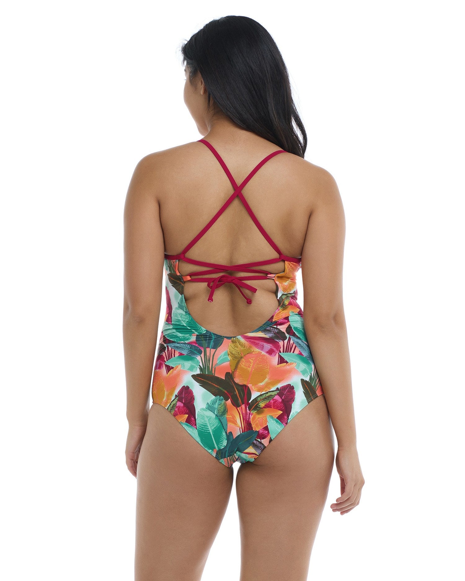Si vous aimez les looks intemporels, le haut Charlie à encolure en V et laçage croisé ajustable au dos est parfait pour vous. Une incrustation à l’avant ajoute une touche de personnalité à ce maillot une-pièce présentant des bonnets souples à coussinet amovible, un soutien-gorge intégré, un tissu à côtes et une couverture complète au dos.