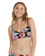 Vous flirtez avec l’idée d’ajouter un peu de piquant à votre tiroir de maillots? Ce motif floral romantique ne manquera pas de vous ravir. Sur un fond noir d’encre, une profusion de fleurs d’hibiscus et de feuilles somptueuses affichent une palette de couleurs d’inspiration vintage. En regardant attentivement, vous remarquerez que chaque pétale semble luire, comme si la lune, que l’on ne voit pas, le baignait d’une douce lueur. Enfilez notre collection Flirt et plongez dans un univers de pur luxe.